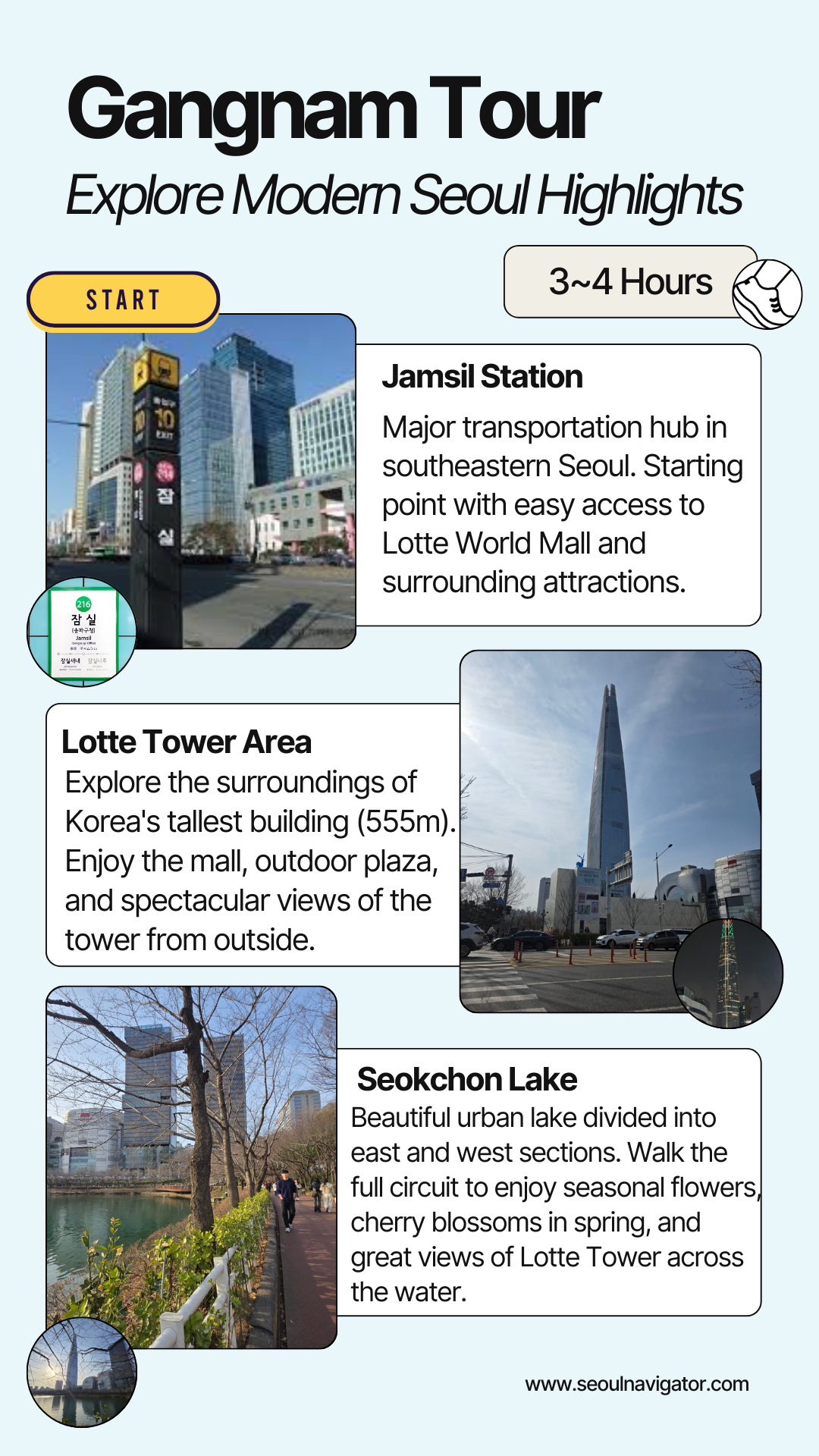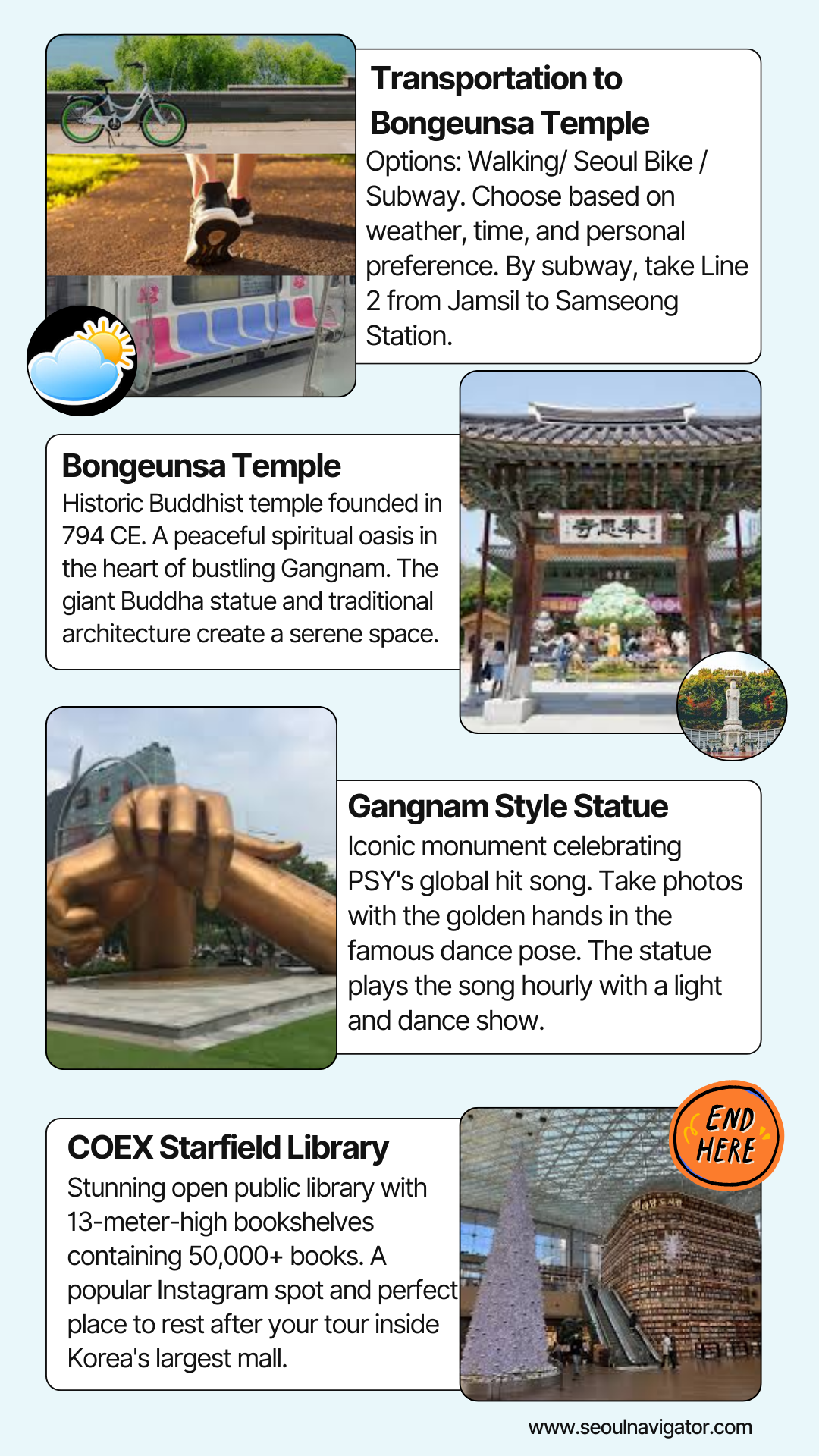 Discover modern Seoul's highlights in this compact journey from Jamsil to Gangnam. Marvel at Lotte Tower, stroll around Seokchon Lake, find tranquility at Bongeunsa Temple, pose with the Gangnam Style Statue, and explore the spectacular COEX Starfield Library. The perfect blend of contemporary architecture, natural scenery, and Korean culture.